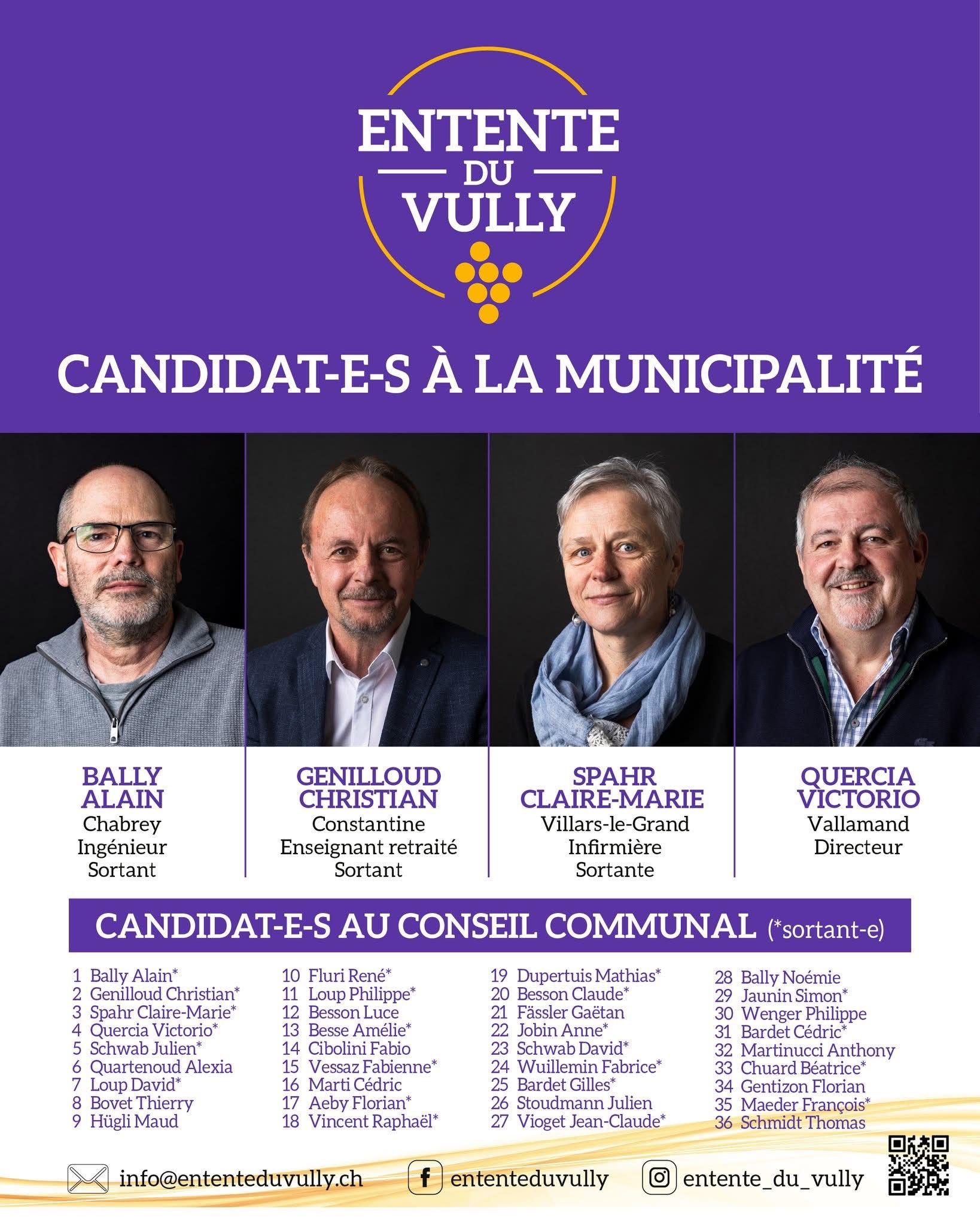 -Infos officielles avec les noms et prénoms des candidat·es de l’Entente du Vully : (lien ici)